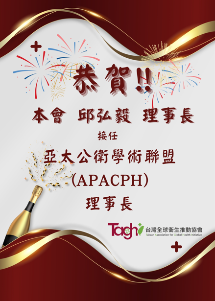 恭賀!! 本會邱弘毅理事長 接任亞太公共衛生學術聯盟理事長 邱弘毅理事長擔任亞太公共衛生學術聯盟(APACPH)財務長、財務副理事長長達十五年,對該會提供堅實的財務支持,使APACPH對亞太地區人民健康做出重大貢獻,成為此區域最有影響力的公共衛生學研組織。